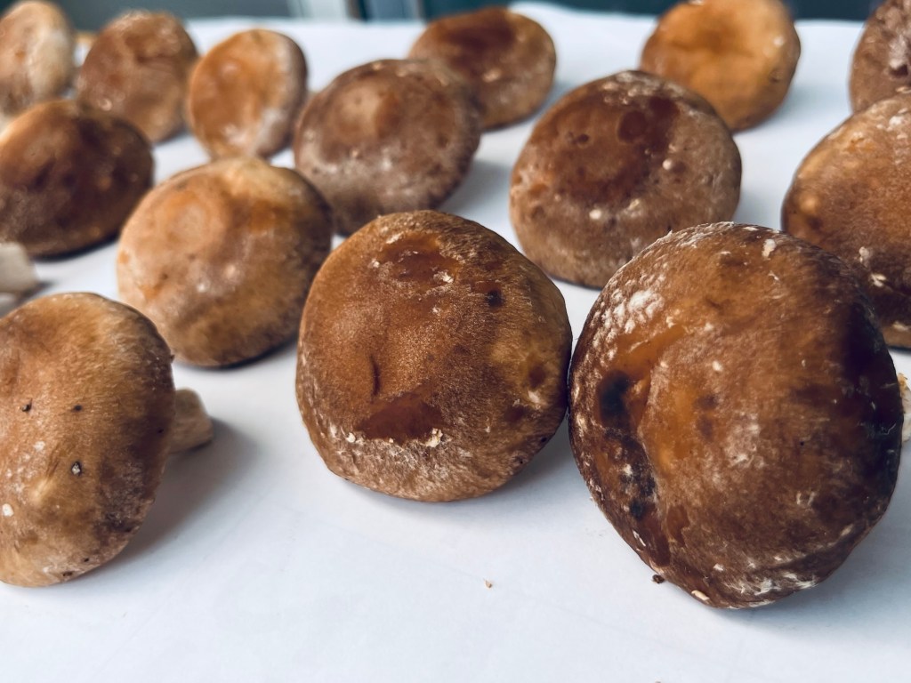 食べきれない椎茸は干し椎茸にしようと、只今天日干し中
